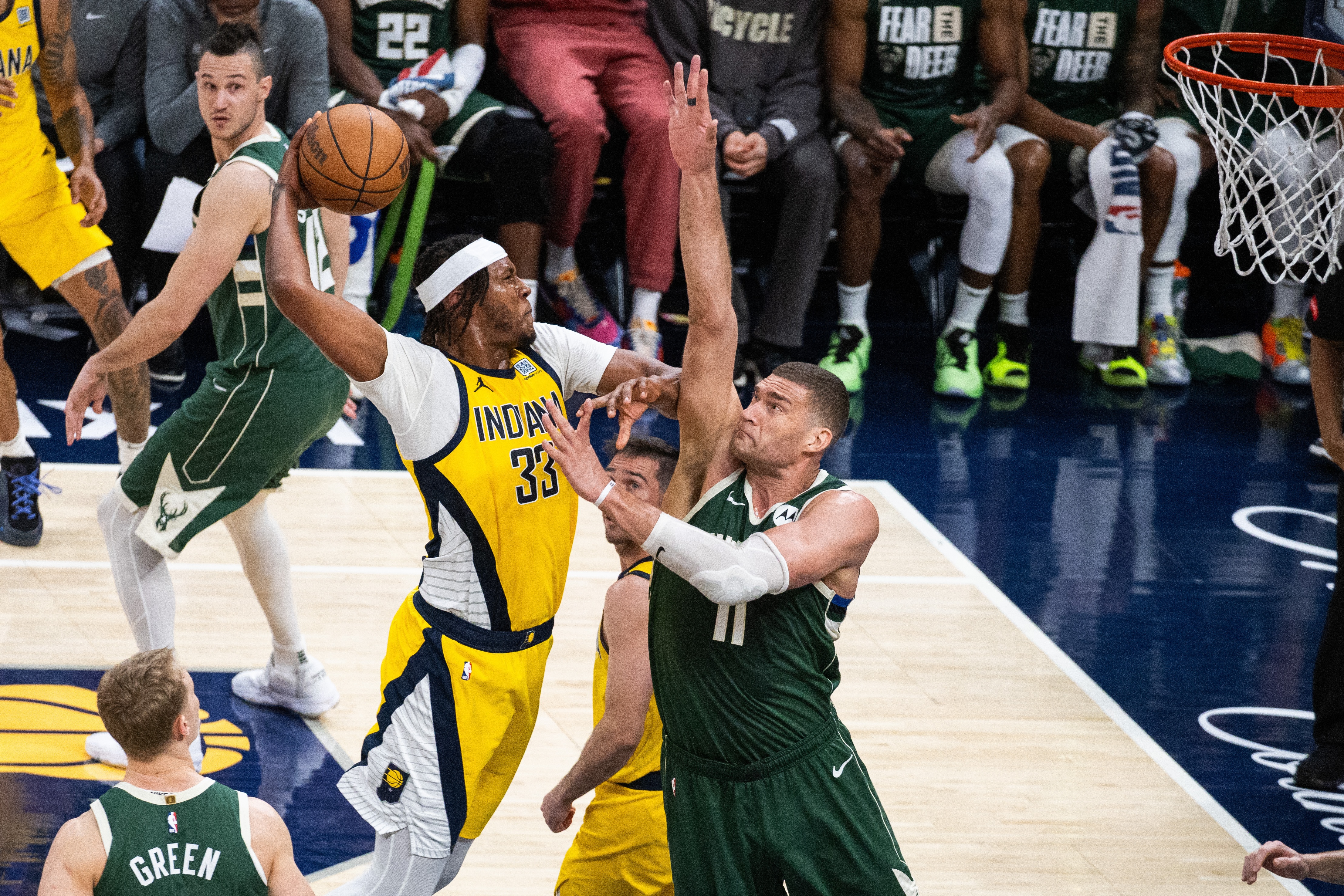 两位中锋在季后赛首轮交锋时,大洛佩斯与特纳的对比展现得淋漓尽致。特纳场均贡献16.8分2.2盖帽,助步行者五场晋级,并延续强势表现直至东决。而大洛佩斯在对阵步行者的最后三场总计仅得8分1盖帽,甚至在系列赛收官战(如今证实为其雄鹿生涯最后一役)将首发位置让位于替补波蒂斯。