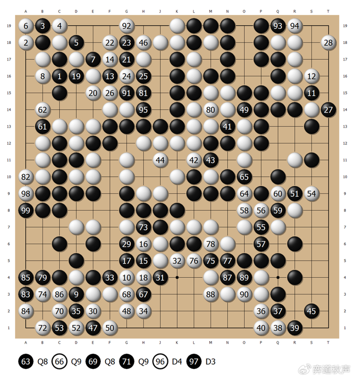 白50飞点,竭力腾挪。此时首日封盘时间到,虎丸将下一手(总第101手封存),交给立会人张栩。首日用时,黑方芝野虎丸4小时22分,白方一力辽3小时38分。